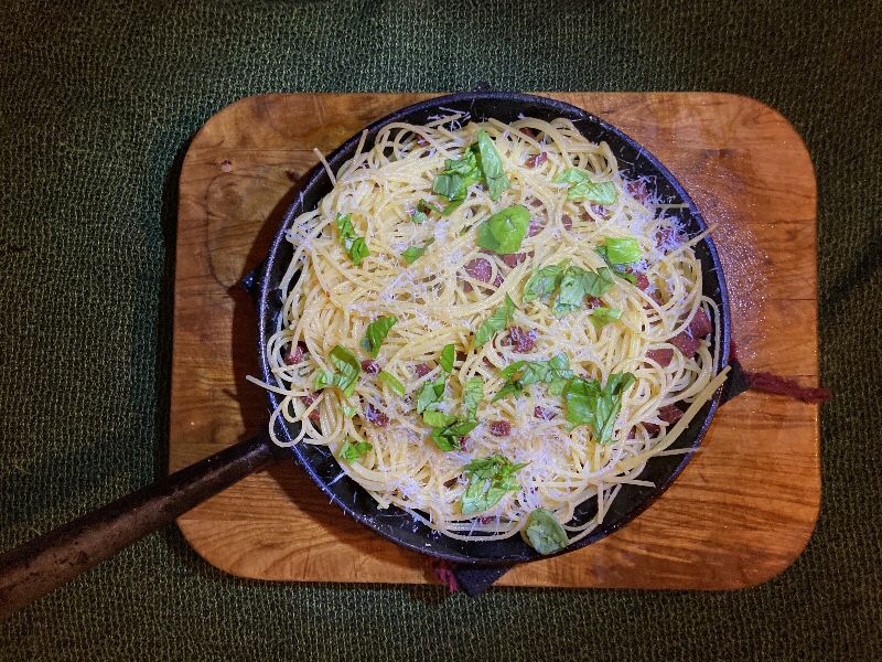 If you’ve timed it right, the spaghetti is now done, so just drain it and pour the spaghetti into the frying pan. Add a few twists of the pepper mill and toss until everything is equally divided throughout. Garnish with the basil.