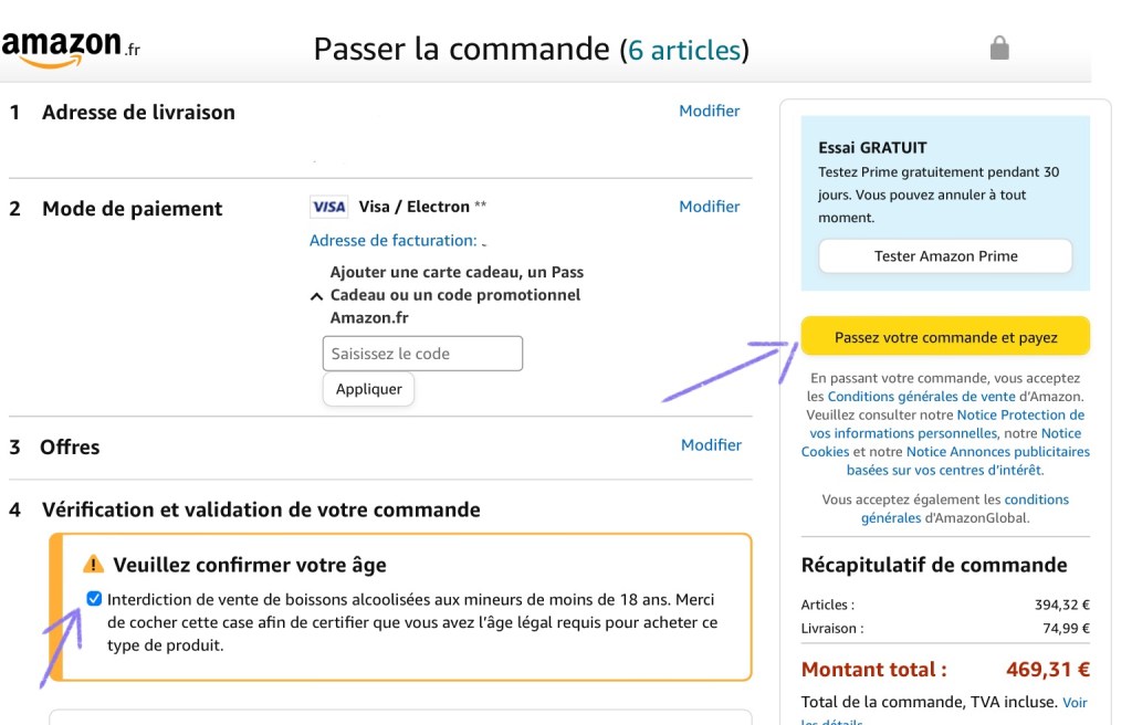 This is where you need to confirm you’re of legal age. If you are, press the tickbox “Veuillez confirmer votre âge” and then press “Passez votre commande et payez”.