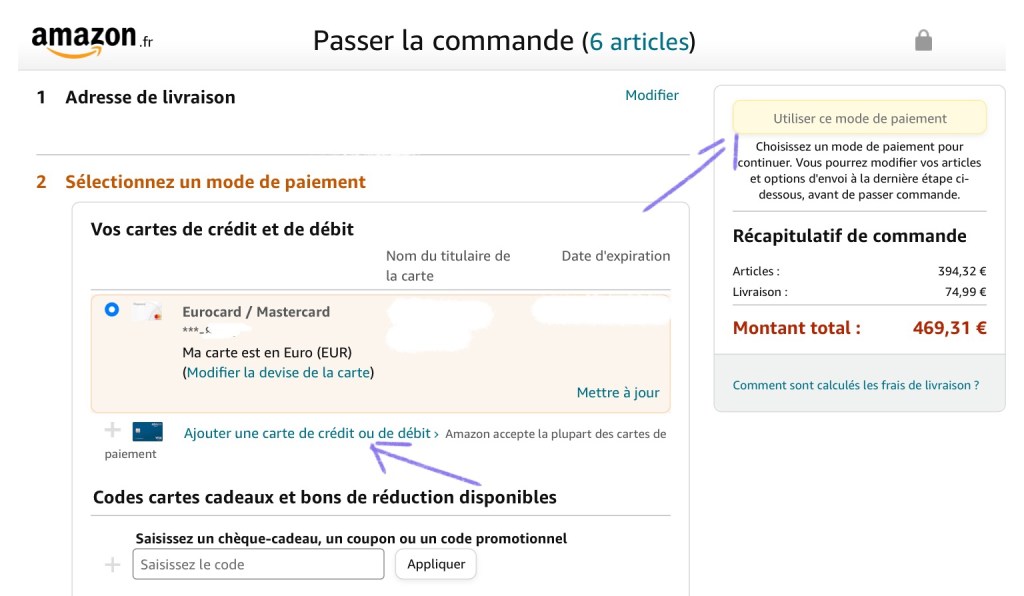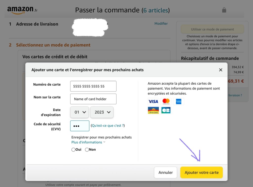 This is where you see the price including shipping and choose a mode of payment. If you have a previously registered card it will be there by default. Then you can just press “Utiliser ce mode de paiement”. If you want to use a different card press “Ajouter une carte de crédit ou de débit.